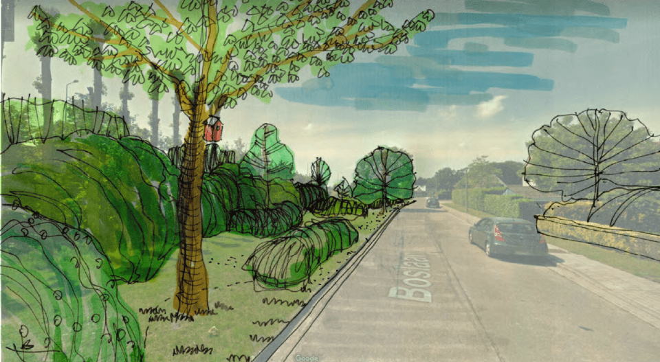 Door deze vervolgens dichter te laten aansluiten op de groenzone naast de N9, kan je een asverschuiving realiseren met een kortere en veiligere overstreek naar de nieuwe groenzone (waar je wandelaars, kinderen en jongeren verwacht). De snelheid in de Boslaan wordt op die manier ook geremd.